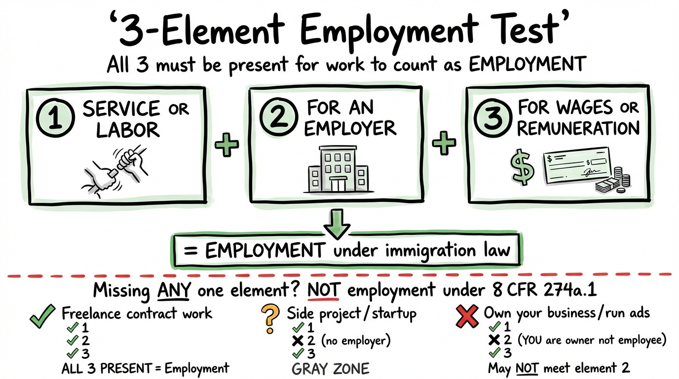 There is also a separate legal concept the employment analysis does not cover: failure to maintain nonimmigrant status under INA 237(a)(1)(C)(i). You can violate your H1B status through activities USCIS deems inconsistent with your classification, even if those activities don’t technically qualify as “employment” under 8 CFR 274a.1. The employment test is not the only test. Keep that in mind.